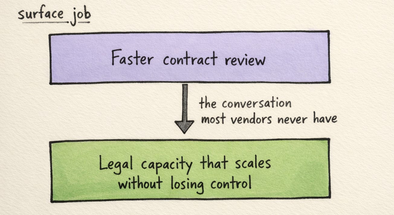 When my prospect said “faster contract review,” she was describing an activity, not a job. The job, once she talked her way into it, sounded more like this: the business sees us as the department that slows things down, I can’t get headcount but the work keeps growing, my best people are burning out on contracts that don’t need their expertise, and I need legal capacity that scales with the business without losing control of quality.