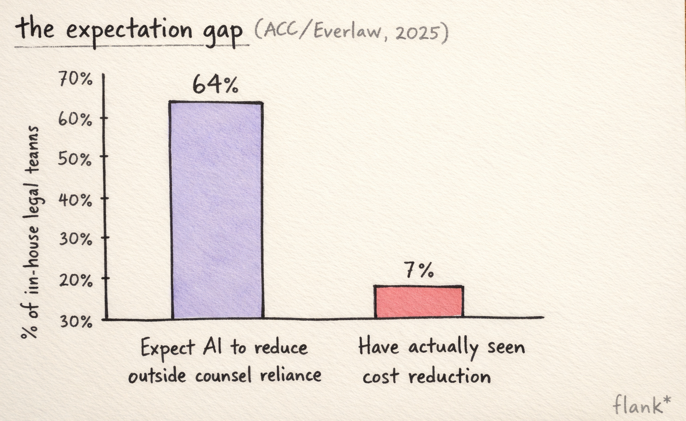 The ACC/Everlaw data makes this visible. 64% of in-house teams expect AI to reduce their reliance on outside counsel. Only 7% have actually seen a reduction in total cost. I think that gap is, in large part, a job-definition problem. The expectation maps to the real job: “change how we absorb work.” The result maps to the surface job: “make our lawyers slightly faster at what they already do.”