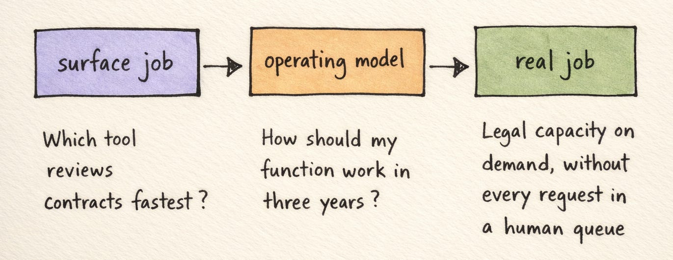 That’s the difference between a surface-level job and the real one. The tool question is downstream of the operating model question. And the operating model question is downstream of the job: make legal a service the business can access on demand, without every request sitting in a queue for a human.