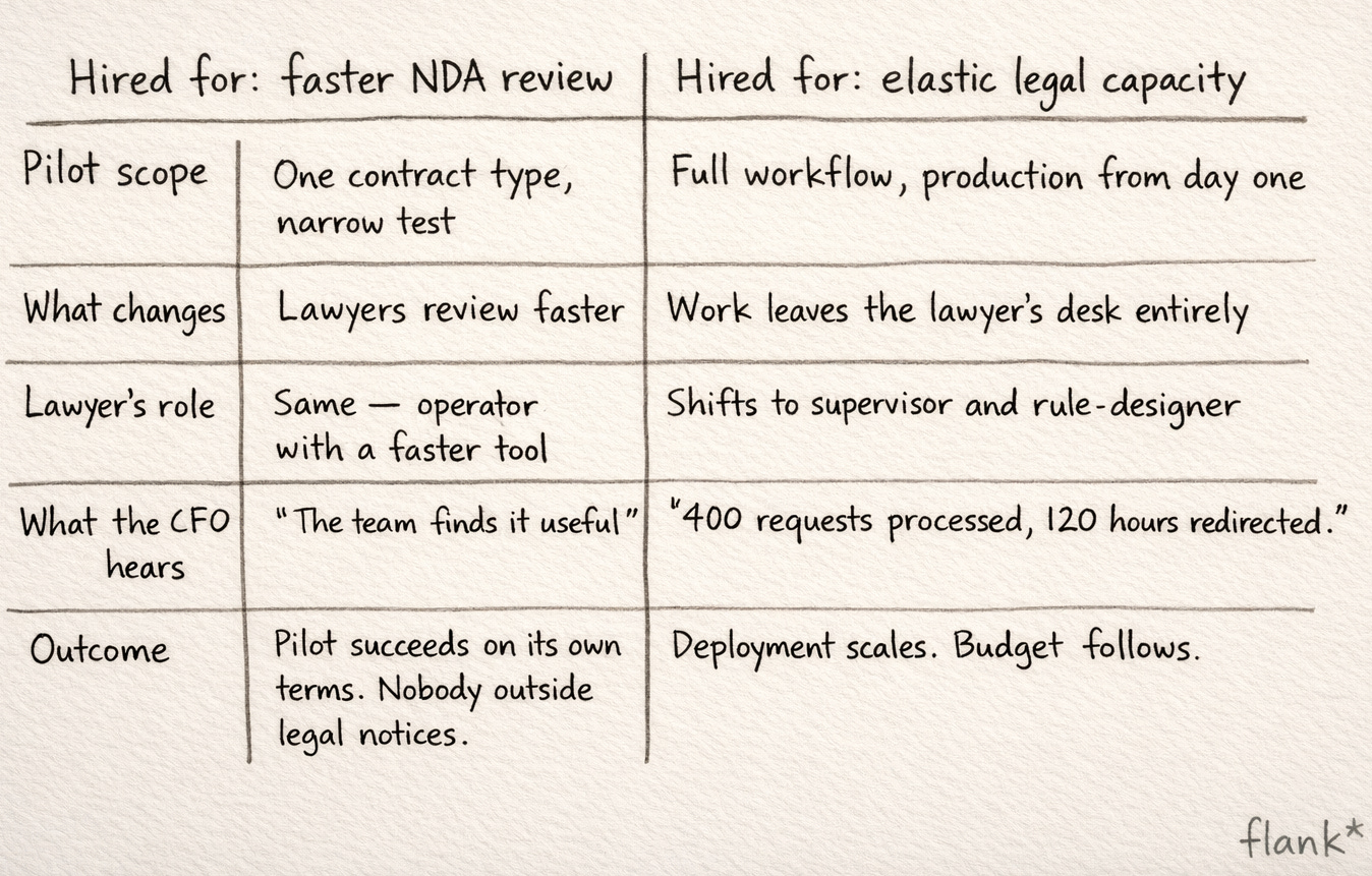 A GC who hires an agent for “faster NDA review” will scope a narrow pilot, see an improvement, maybe expand to a second contract type. But they won’t redesign how their team operates, because the job they defined didn’t call for it. The pilot succeeds on its own terms and fails to produce any result anyone outside the legal team notices.