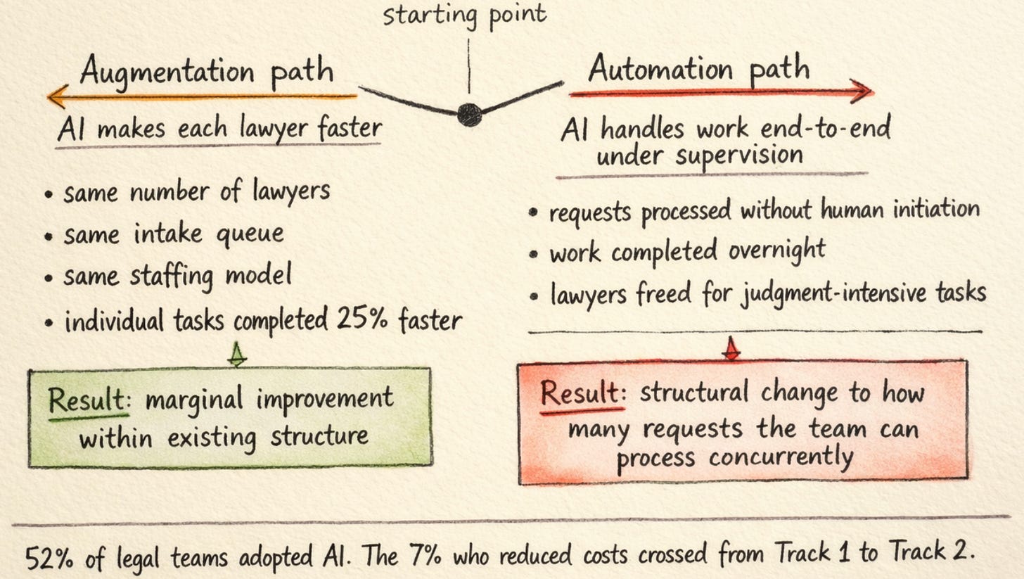 The legal AI market has spent three years conflating these two categories. The 52% adoption figure captures both. The 7% cost reduction figure captures almost exclusively the second category, because augmentation tools do not change the staffing model. They change the speed of individual tasks within the same staffing model. The constraint on legal team throughput has never been how fast a single lawyer can review a single NDA. The constraint is how many requests the team can process concurrently, which is bounded by how many lawyers are available to pick work up off the pile.
