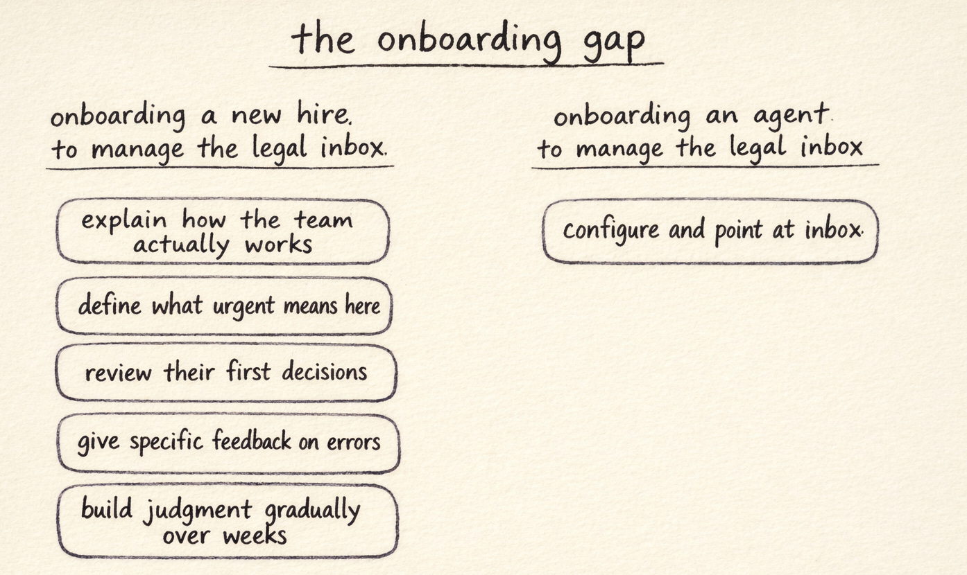 Think about what you would actually do if you hired someone to manage your legal team’s shared inbox, sixty to eighty requests a day, sorting what needs a lawyer, what can be handled by ops, what is genuinely urgent, and what can wait a week. You would not hand them the login and walk away. You would explain how the team actually works: which business units tend to send things that sound urgent but aren’t, which request types are always the GC’s call regardless of how they’re framed, how a supplier dispute is different from a routine contract request even when they arrive in identical-looking emails. You would review their first few weeks of decisions, flag the ones where their judgment differed from yours, and explain why. You would build their understanding of your organisation’s priorities gradually, by showing them what good looks like and correcting what isn’t. You would ask questions and expect them to ask questions back.